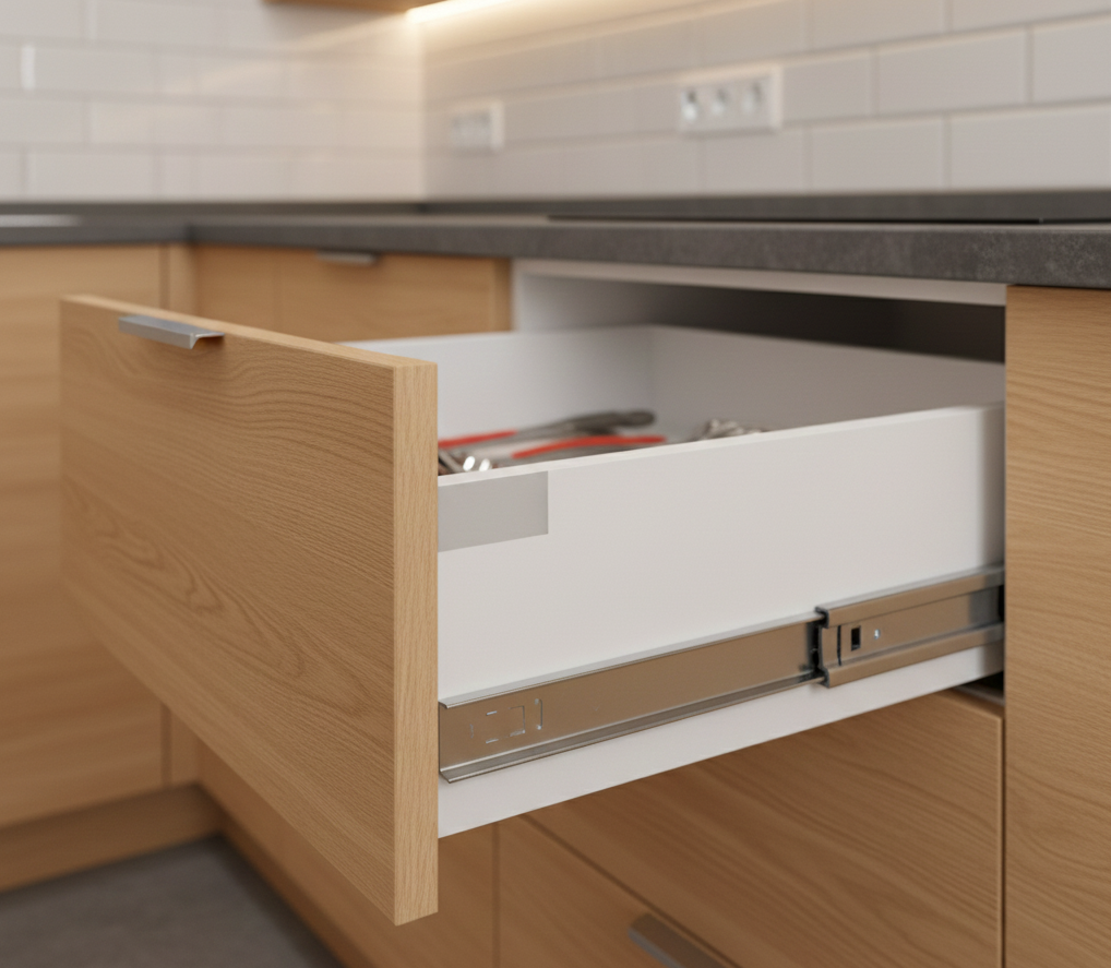 cena zahrnuje montážní a spojovací materiál, vyladění a srovnání zásuvek po opravě, nezahrnuje však nové pojezdy v případě potřeby výměny.